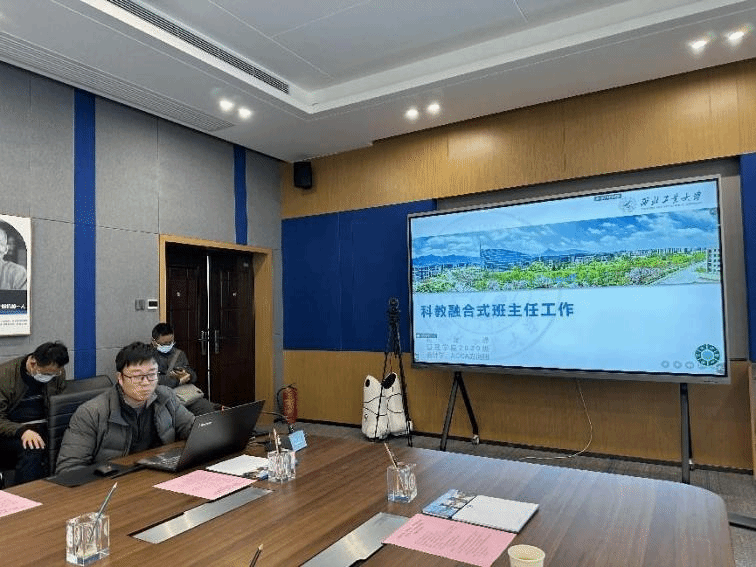 会议第三项由来自管理学院班主任赵龙峰进行题为《科教融合式班主任工作探索》的交流汇报,赵龙峰老师从思政学风、科研拓展、服务学生等方面交流了科教融合式班主任工作的经验做法。