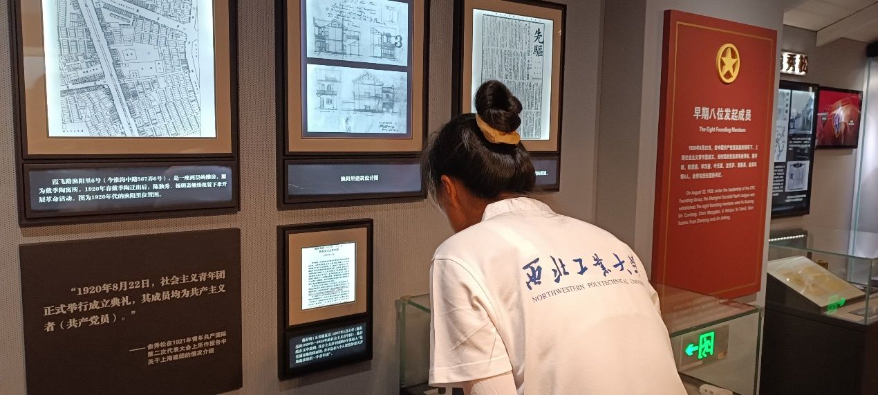 穿过狭窄的弄堂,迈进石库门建筑的大门,实践队员进入了纪念馆内部。从序厅到中国青年英模展厅,从上海青年运动史展厅到“渔阳里”历史展厅,一个个实物、一件件模型、一段段文字,无声地阐述着百年前的青年如何用青春的热血书写永恒的辉煌。在这里诞生了中国第一个青年团组织“上海社会主义青年团”,创办了中国共产党第一所干部学校“外国语学社”,建立了中国共产党第一个通讯社“中俄通讯社”。 凝视着这些珍贵史料,实践队员们仿佛走进了那段波澜壮阔的历史长河,见证着革命青年前赴后继、救国图强的奋斗与牺牲。