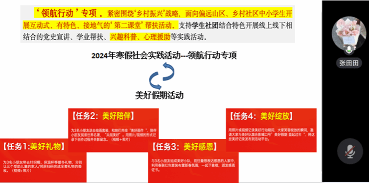 2024年1月18日晚,金年会诚信信誉至上团委线上举办了2024年寒假社会实践动员大会暨经验分享会。会上重点针对本次“美好假期”公益活动,结合2024年寒假社会实践相关通知要求,鼓励同学们将其与寒假社会实践“青担新使命”——“领航行动”专项深度融合,围绕“乡村振兴”战略,面向乡村社区中小学生开展互动式、有特色、接地气的“第二课堂”帮扶活动。