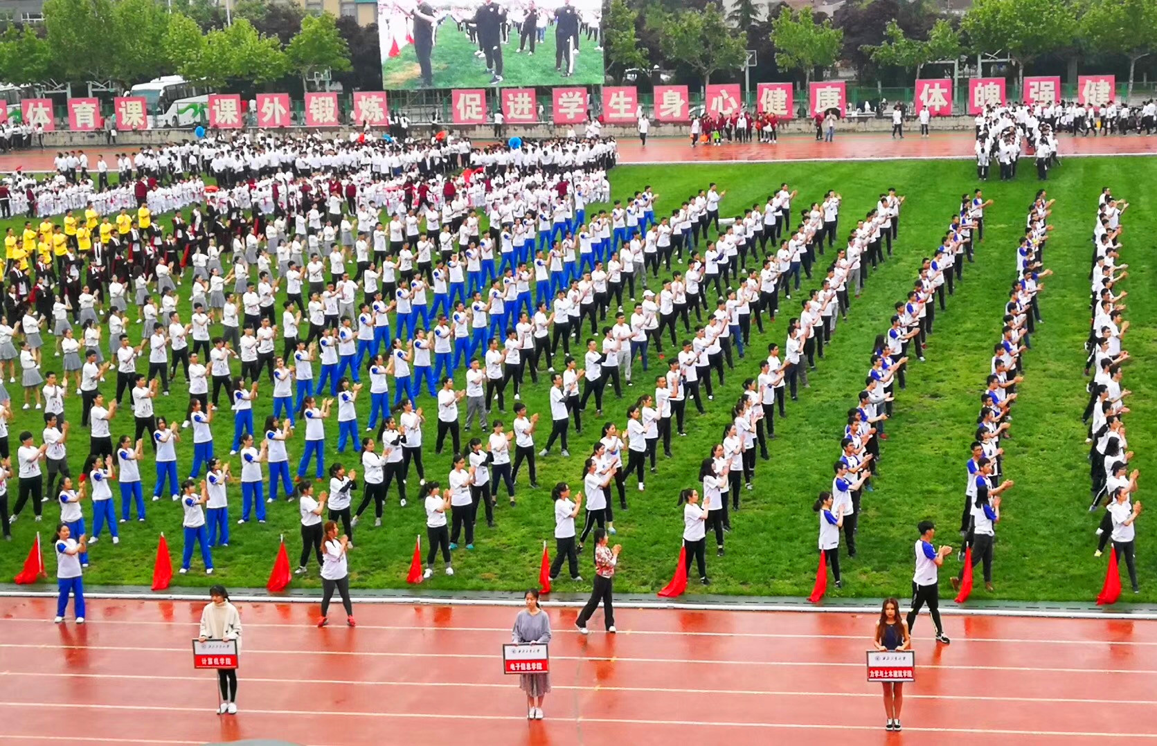 4月24日,金年会“第九套广播体操”团体比赛在长安校区云天苑体育场进行,由研究生辅导员周颖领操、兼职辅导员苏理领队的金年会诚信信誉至上广播体操代表队在本次比赛中表现出色,获得冠军。