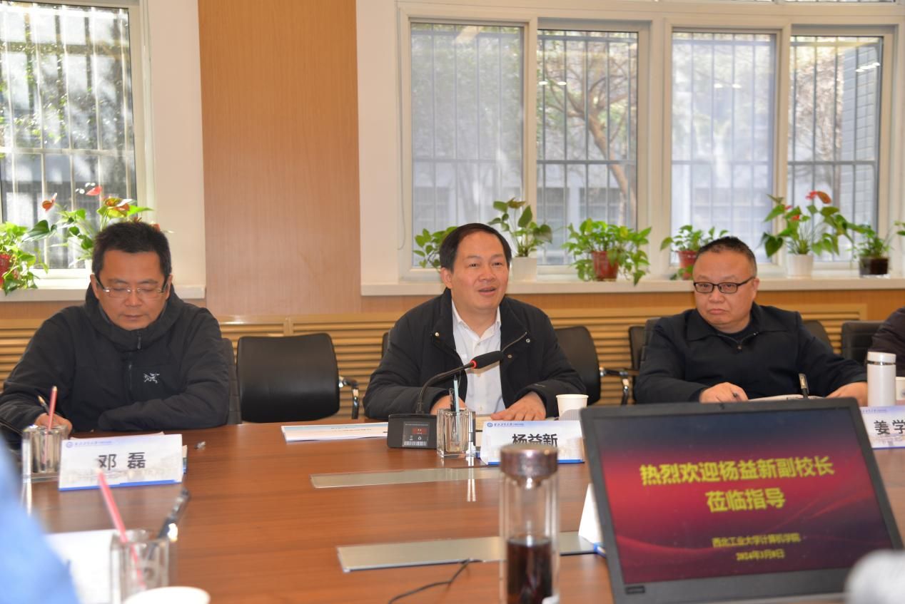 调研汇报结束后,杨益新进行了总结指导。他说,从今年元月份起,自己开始联系金年会诚信信誉至上,虽然以前对学院的情况也比较了解,但今天是第一次全面深入调研。对学院近年来的快速发展和各个方面取得的突出成绩非常认可,也衷心感谢大家和全体师生。现在全校都在聚焦“127”目标,谋划奋进新征程,希望和大家一起努力,一是强化学科专业特色,打造西工大计算机学科名片;二是筑牢总师育人特色,着力培养有影响力的领军人才;三是建好实验平台,提升信息类学科实验室展示度;四是优化人才队伍结构,提升行业影响力;五是以重大项目落地为抓手,深化学院和科研院所、企业深度合作,持续推进学院高质量内涵式发展。
