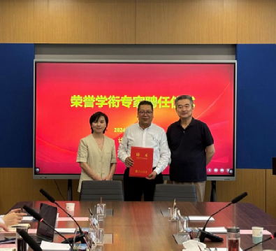 尚学群介绍了田泽的基本情况,为田泽颁发客座研究员聘书并赠送纪念品,樊晓桠为田泽佩戴院徽。