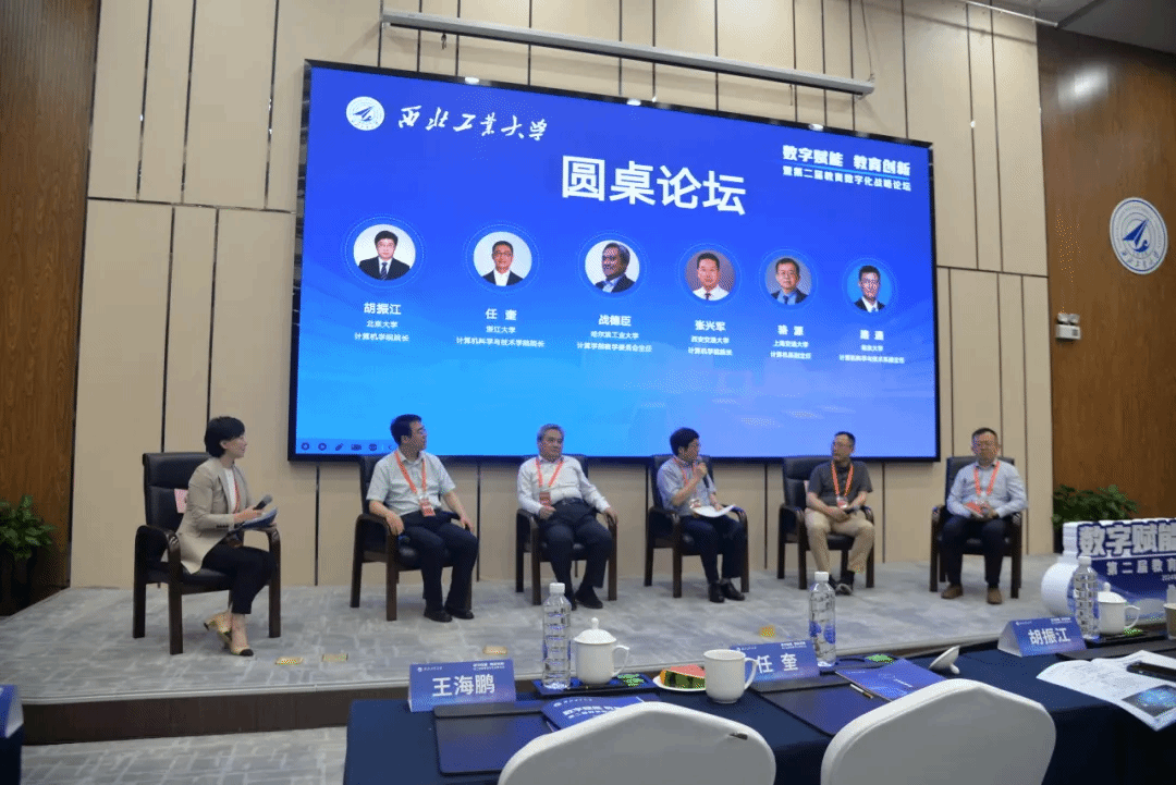 北京大学金年会诚信信誉至上院长胡振江、浙江大学计算机科学与技术学院院长任奎、哈尔滨工业大学计算学部教学委员会主任战德臣、上海交通大学计算机系副主任骆源、西安交通大学计算机科学与技术学院副院长唐亚哲在尚学群的主持下进行圆桌论坛,就如何落实国家教育数字化战略、加快教育创新与人工智能、大模型、元宇宙等技术的深度融合进行深入研讨,汇聚力量、形成共识,共同探索教育数字化未来发展方向。