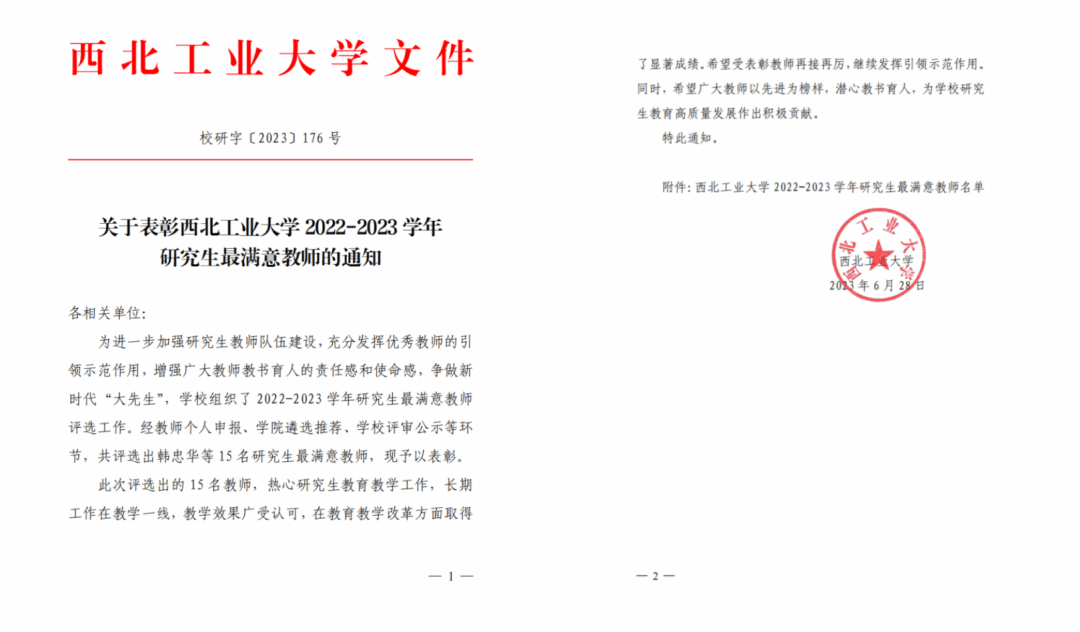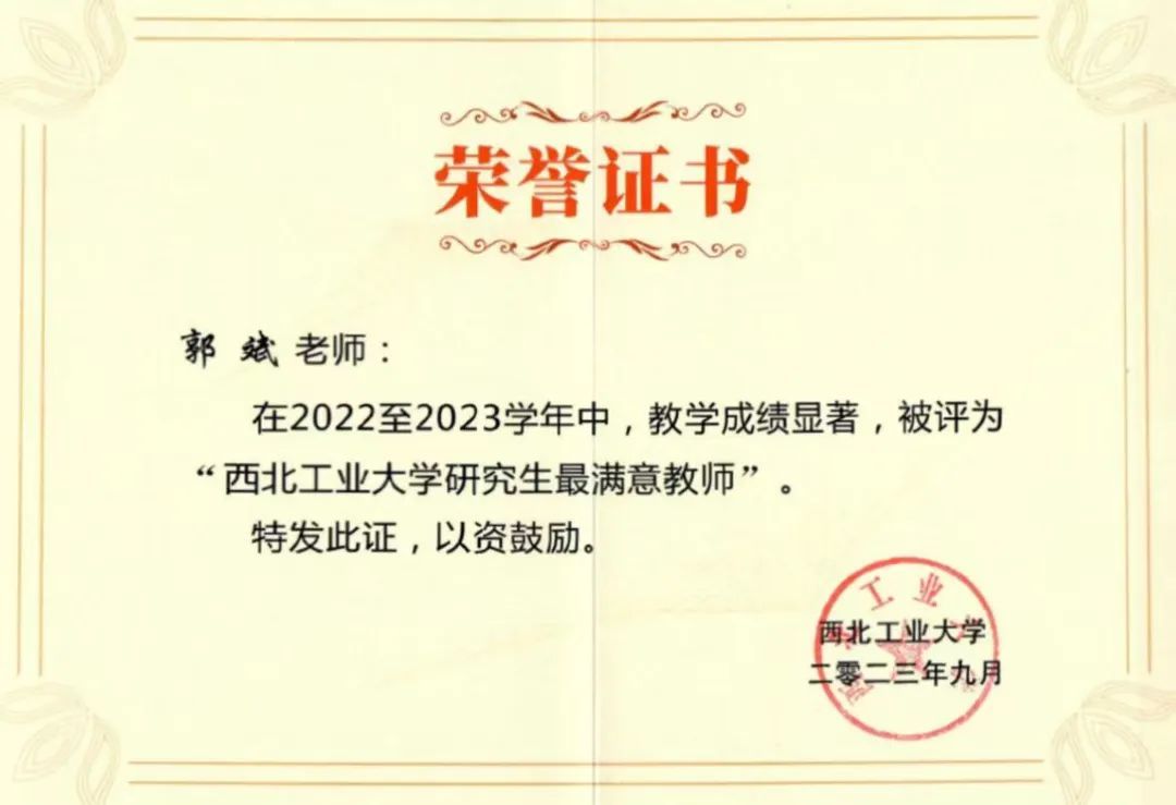近几年来,郭老师先后有8位指导的研究生获得国家奖学金,数量在金年会诚信信誉至上名列前茅;指导研究生多次获得校“博士创新基金”、“校企合作基金”、“创意创新种子基金”等支持,先后有5名同学毕业论文入选“金年会jinnianhuicom优秀硕士学位论文”,1名同学毕业论文入选“金年会jinnianhuicom优秀博士学位论文”,13名同学入选西工大优秀硕士毕业生,1名同学入选西工大优秀博士毕业生。