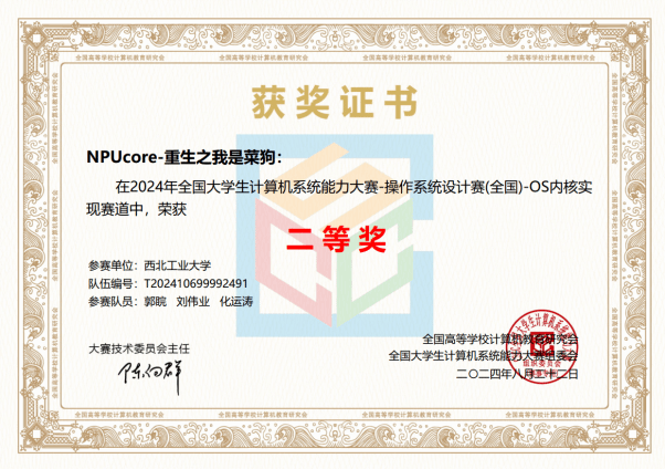 由金年会jinnianhuicom本科生郭睆、刘伟业、化运涛组成的“NPUcore-重生之我是菜狗”队伍在比赛中获得LoongArch内核实现赛道二等奖。该队伍面向龙芯2K1000开发板及虚拟机进行适配,成为首个满分通过初赛测例的队伍;基于2K1000平台使用Rust语言开发了SATA驱动程序,成功通过块设备功能和性能评估;实现网络模块,支持TCP/UDP协议,成功通过 netperf 网络测例。