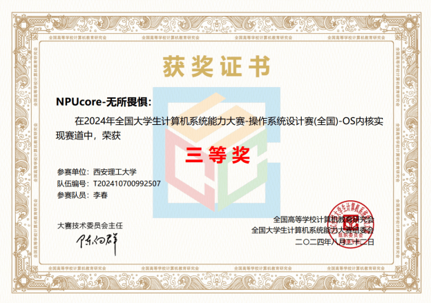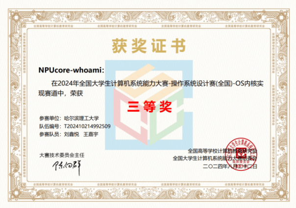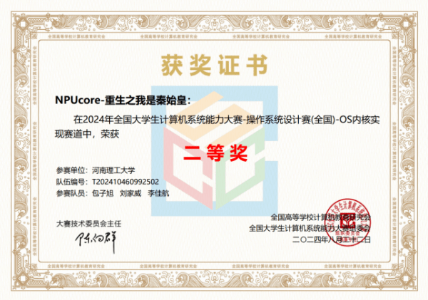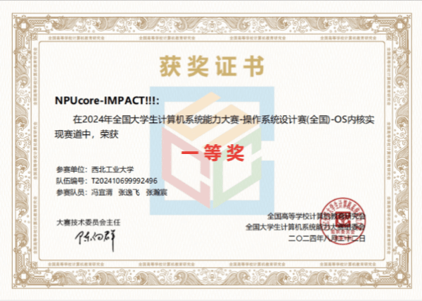 金年会jinnianhuicom本科生冯宜湑与软件学院张逸飞和网安学院张瀚宸组成的“NPUcore-IMPACT!!!”队伍获得LoongArch内核实现赛道一等奖。该队伍的NPUcore-IMPACT内核使用Rust编写,基于龙芯架构支持2K1000开发板及其虚拟机,支持106个系统调用和FAT32/EXT4文件系统,并在初赛决赛取得最高分,成为该赛道唯一libc-bench得分队伍。