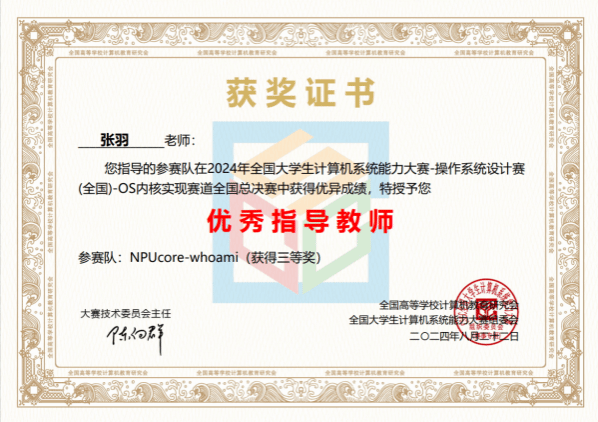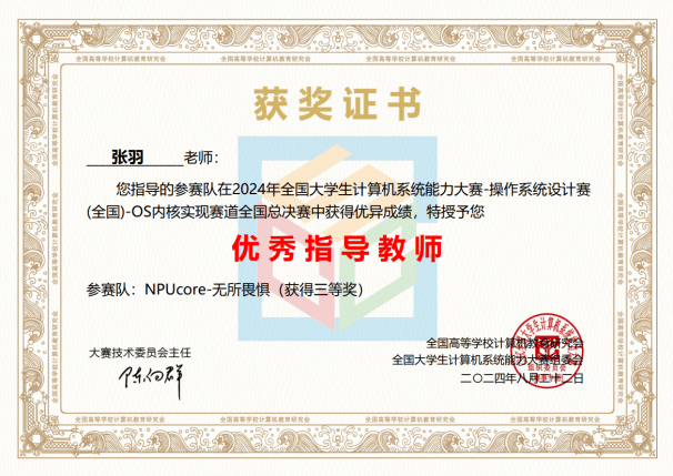 另外,在我院张羽教授的指导下,来自河南理工大学的包子旭和哈尔滨理工大学刘鑫悦、西安理工大学李春同学,分别在在内核实现赛龙芯LoongArch赛道全国总决赛二等奖和RISC-V赛道全国总决赛三等奖。