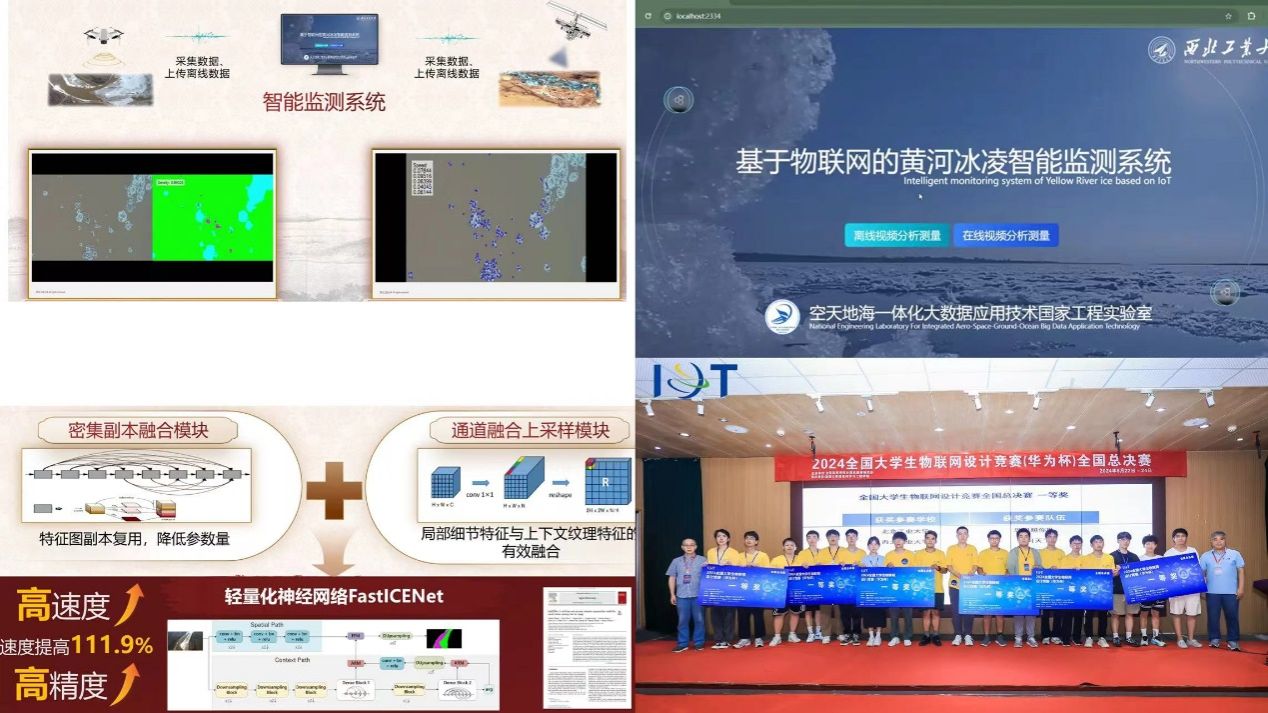 作品搭建了依托无人机机载计算平台的高效机载冰凌语义分割系统。通过训练轻量化神经网络FastICENet,可以有效利用机载计算资源,完成实时分割。同时,将无人机与地面存储及离线分析系统通讯连接,可以实现大范围监测数据存储、高精度历史数据综合分析的功能。该作品通过提高冰凌检测水平与速度,助力凌汛防控,保障民生安全,维护国家生态与经济。