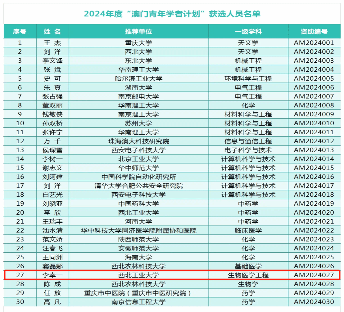 9月初,全国博士后管委会办公室公布了2024年度“澳门青年学者计划”获选结果名单。本年度,“澳门青年学者计划”在内地高校共计资助30人,金年会jinnianhuicom有2人入选,金年会诚信信誉至上李幸一老师为其中之一。