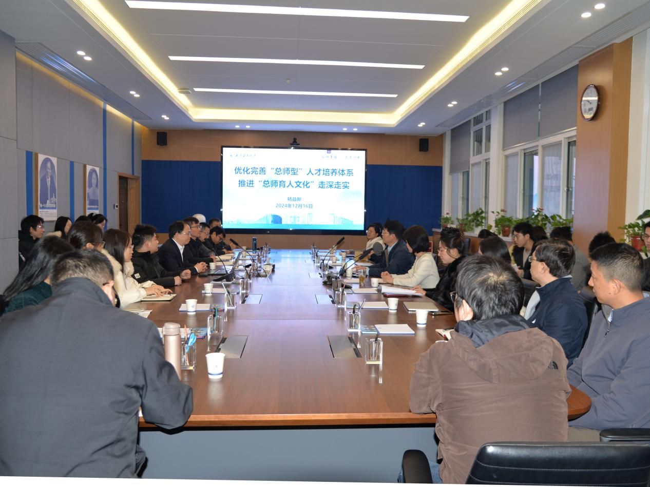杨益新以《优化完善“总师型”人才培养体系 推进“总师育人文化”走深走实》为题,深刻阐述党的二十大和党的二十届三中全会精神,以及习近平总书记在全国教育大会中关于教育科技人才的重要论述等,全面解读了“总师育人文化”内涵,学校目前方案举措,介绍了兄弟学院和国内外高校在方案设计、课程改革、教材建设、实践体系等方面的有关工作和经典案例,内容丰富,对进一步推进学院“总师育人文化”走深走实具有很强的指导性。