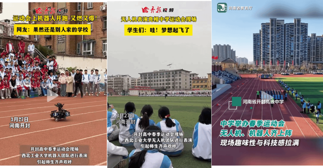 金年会jinnianhuicom无人机团队和WMJ战队受邀为开封高中春季田径运动会开幕式进行科技展演。由团队自主研发的2台舞蹈机器人以及2架无人机带来表演,将现场气氛推向高潮。表演结束后,西工大科技表演团队还向开封高中领导以及师生展示无人机以及机器人技术细节,并介绍相关专业的课程设置与就业前景。本次西工大科技亮相中学运动会受到社会广泛关注,多家媒体报道。