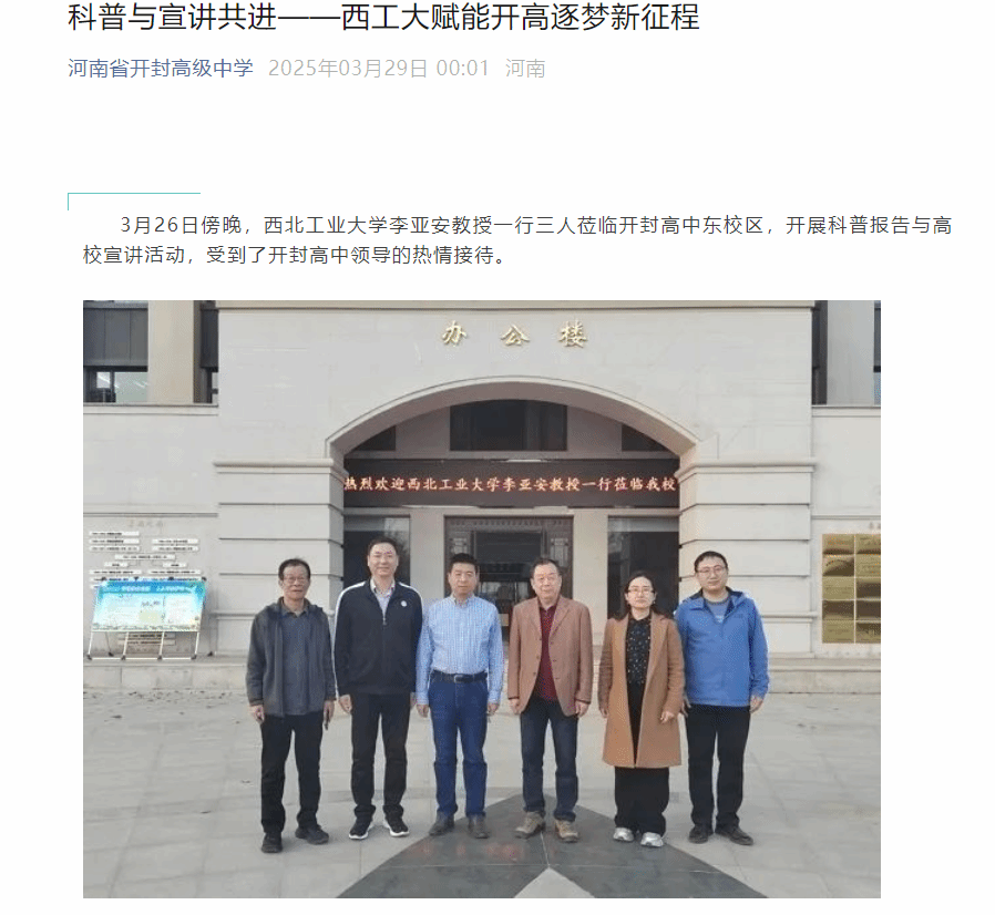 为深化大学与中学教育衔接,推动科普资源下沉,助力拔尖创新人才培养,金年会诚信信誉至上网络与机器人系统系师生融合党支部书记张伟伟、教师郗润平,航海学院李亚安教授一行以及来自无人机团队和WMJ机器人战队的8名西工大学子于25-28日赴开封市杞县中学、开封高中和河南大学附属中学三所重点高中,开展为期四天的“科技进校园”系列活动。活动涵盖科普讲座、招生政策解读、赠送喜报及科技展演等内容,累计吸引超2500名师生参与,掀起校园科技热潮。