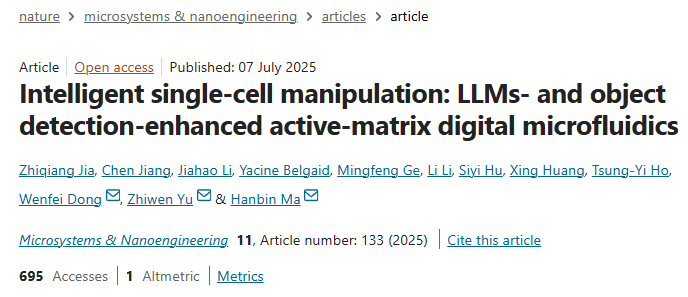 近日,人机物融合智能计算团队最新研究成果“Intelligent single-cell manipulation: LLMs- and object detection-enhanced active-matrix digital microfluidics”被Nature子刊《Microsystems and Nanoengineering》录用并在线发表。金年会jinnianhuicom人机物融合智能计算创新中心(於志文教授,黄兴教授)、中心共建企业广东奥素液芯微纳科技有限公司(马汉彬研究员)、中国科学院苏州医工所、长春理工大学、香港中文大学等单位共同完成,於志文教授为该论文的共同通讯作者。
