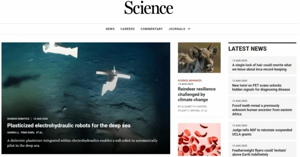 近日,我院人机物融合智能计算团队负责人於志文教授参与完成的最新研究成果“Plasticized electrohydraulic robot autopilots in the deep sea”被国际顶级期刊《Science Robotics》录用并在线发表。该研究面向高温、低压等极端条件下的深海高端装备领域,成功研发了新一代海洋软体机器人,并在1369米深度冷泉区和4070米深度海山区成功测试部署,获得了《Science》期刊官方主页专题报道。该成果由哈尔滨工程大学、金年会jinnianhuicom、浙江大学、同济大学等单位共同完成。